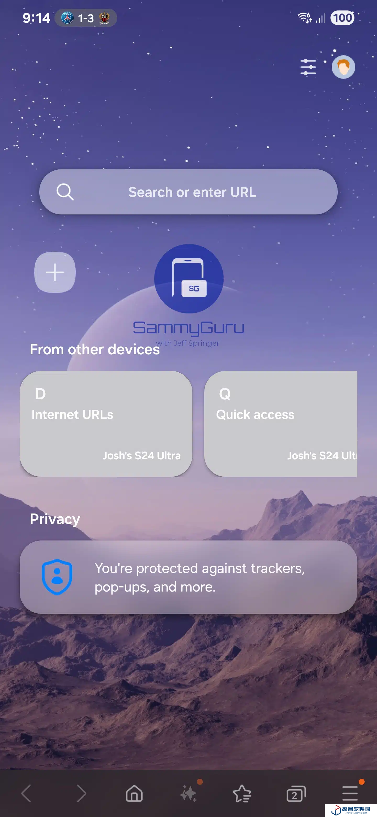 三星明顯增加了頁面元素間距,不再顯得擁擠。主頁還新增了一個輪播功能,展示 Samsung Account 同步的設備上,用戶近期訪問的網站。搜索欄位置靈活,可根據用戶設置顯示在屏幕頂部或底部,隱私報告等元素加入了模糊效果。