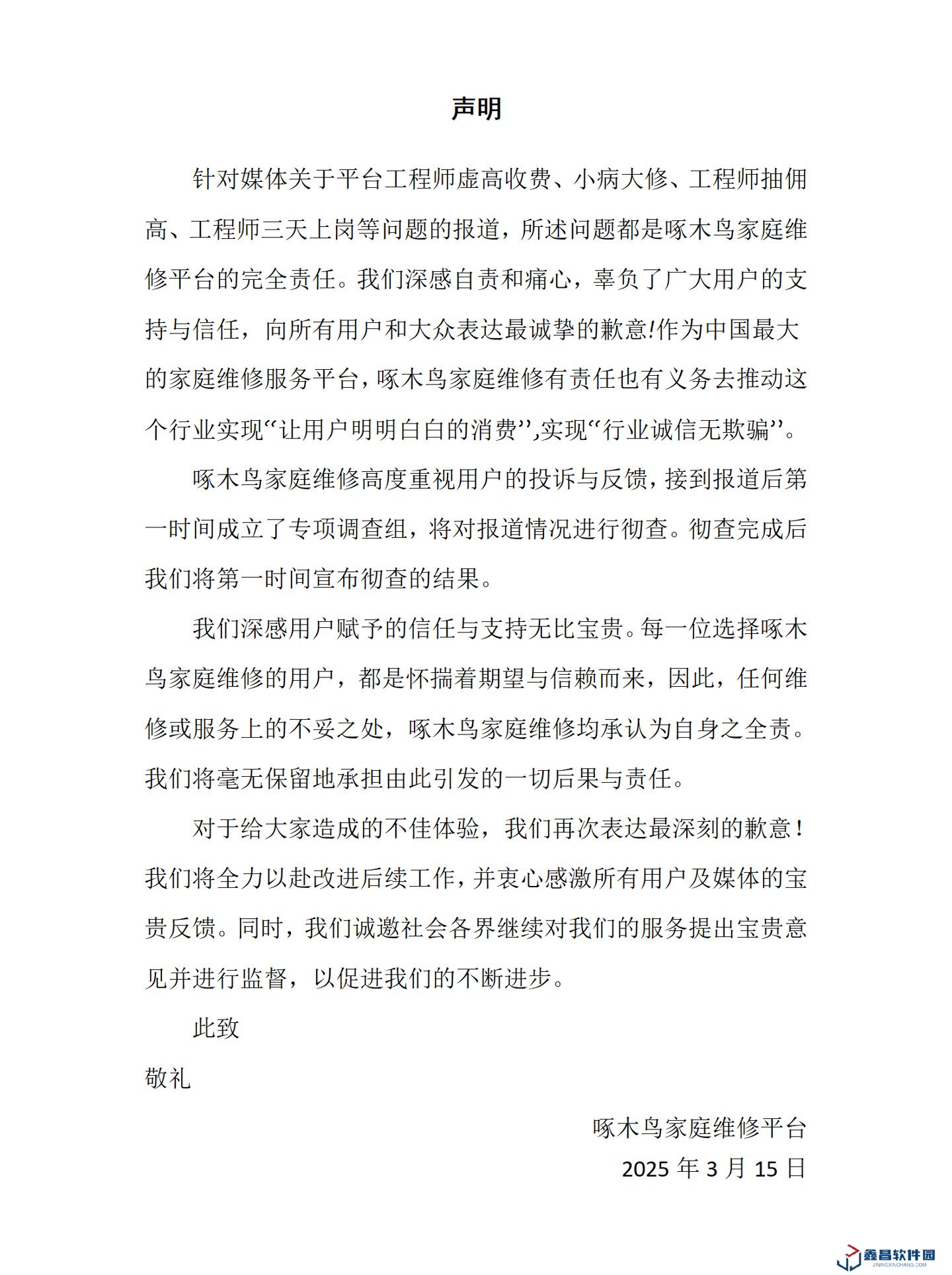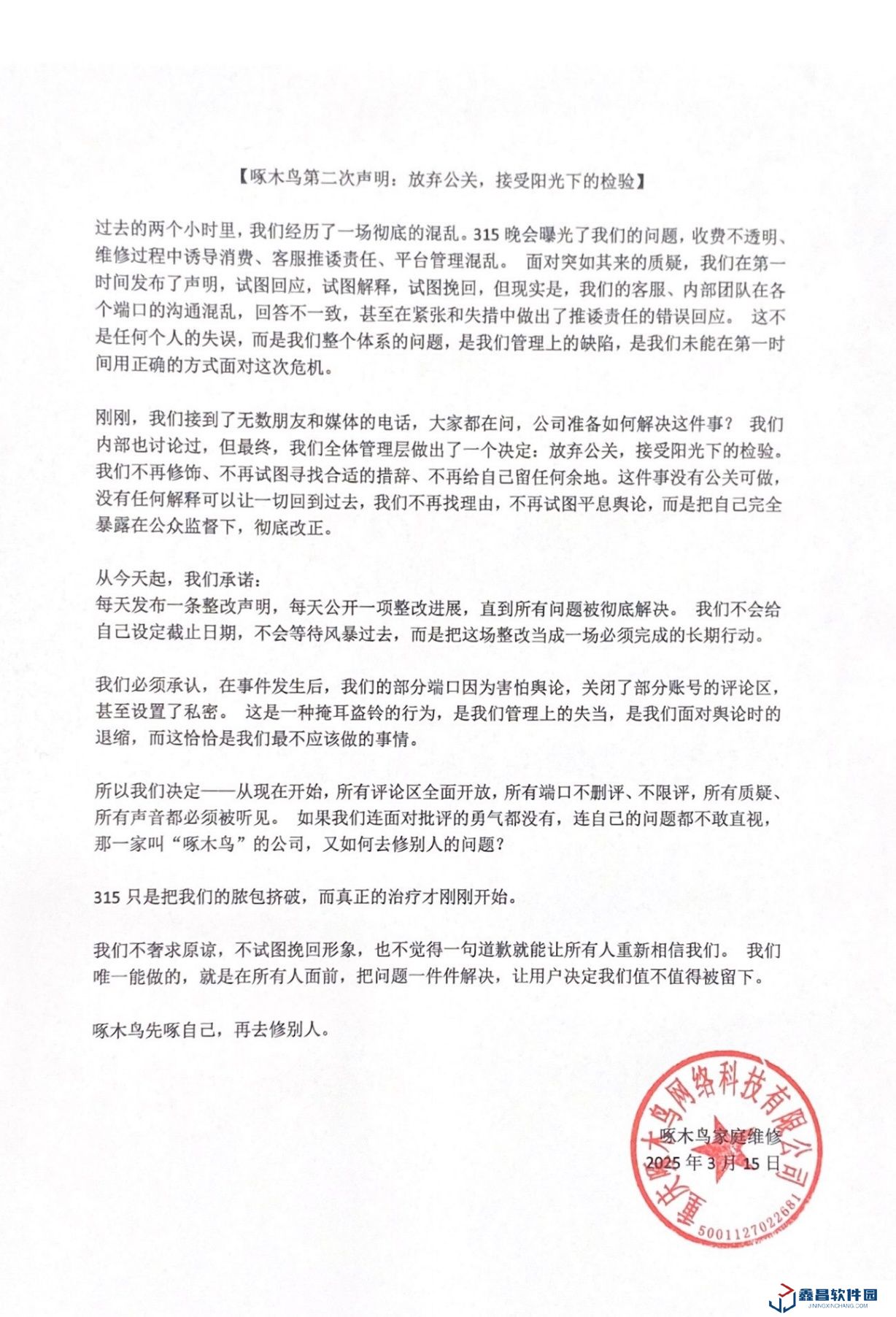 本站注意到,啄木鳥家庭維修官方發布第二次聲明,表示放棄公關,接受陽光下的檢驗。聲明內容如下:
