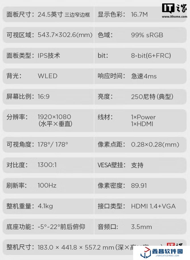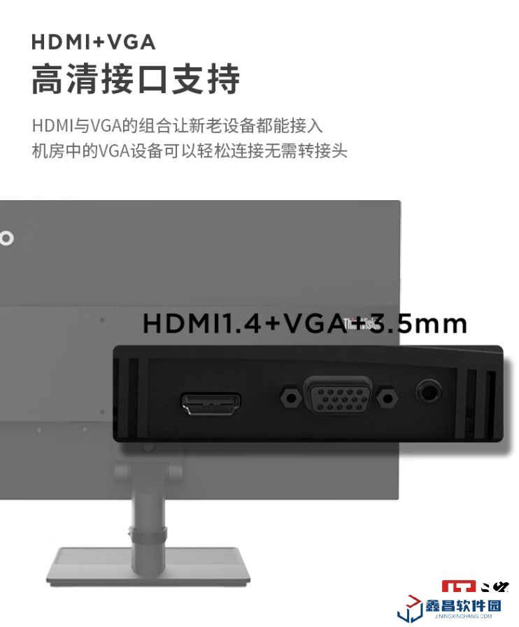 這款顯示器支架支持俯仰,顯示器本體支持VESA壁掛,提供1個(gè) HDMI 1.4接口、1個(gè) VGA接口、1 個(gè) 3.5mm音頻接口。