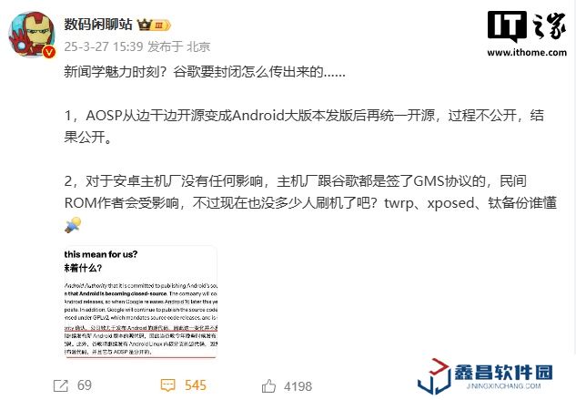 除此之外,也有大量業(yè)內(nèi)人士對于所謂的“閉源”進(jìn)行了解釋,稱谷歌“閉門開發(fā)”并不意味著安卓變成閉源系統(tǒng),因此并不會對 OEM 廠商造成影響。此舉可能會對部分個(gè)人開發(fā)者產(chǎn)生影響,同時(shí)也不方便媒體從公開代碼中挖掘安卓新功能。