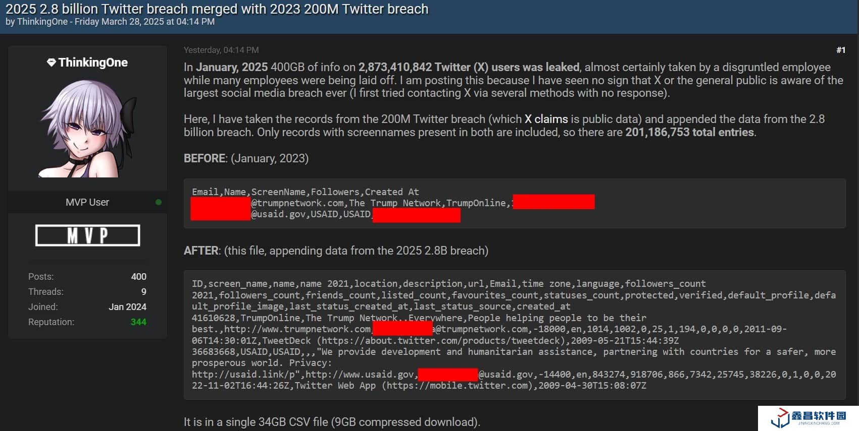本站 3 月 31 日消息,據外媒 HACKREAD 報道,數據泄露論壇 Breach Forums“知名”用戶 ThinkingOne 當地時間 28 日表示,X 社交平臺于今年 1 月發生了一起異常嚴重的數據安全事件:存儲了 28 億 7341 萬 842 條賬戶個人數據信息的 400GB 數據遭遇泄露。