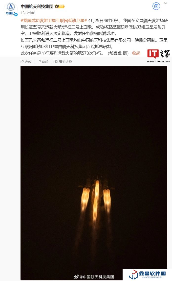 本站 4 月 29 日消息,據中國航天科技集團消息,今日 4 時 10 分,我國在文昌航天發射場使用長征五號 B 運載火箭 / 遠征二號上面級,成功將衛星互聯網低軌 03 組衛星發射升空,衛星順利進入預定軌道,發射任務獲得**成功。