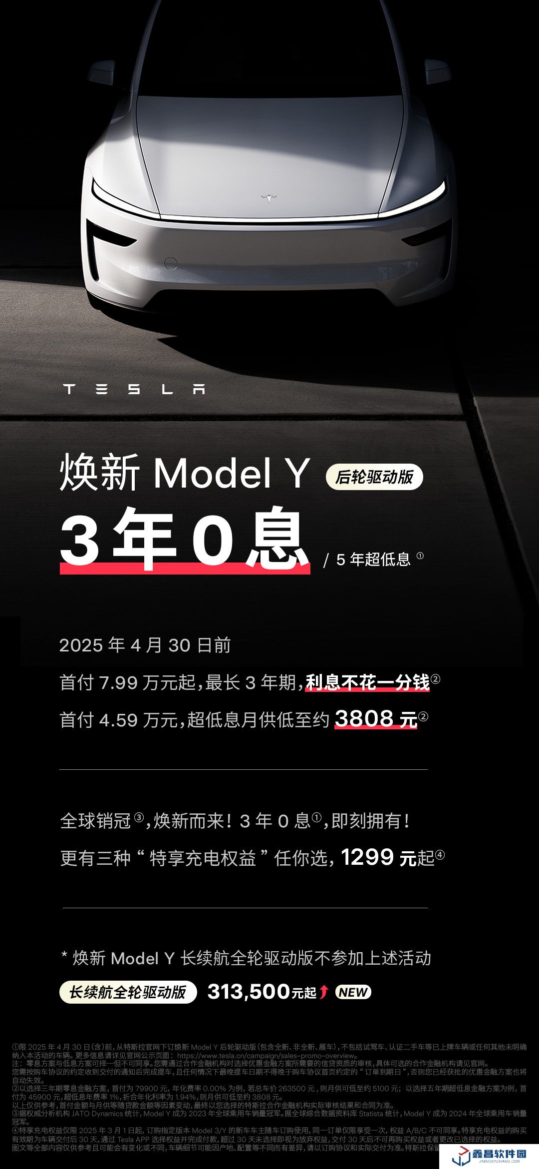 特斯拉宣布在 4 月 30 日前為煥新 Model Y 后輪驅動版推出 3 年 0 息和 5 年超低息政策,月供最低 3808 元。Model 3 限時保險補貼將于 3 月 31 日結束,在那之前提車全系現車補貼 8,000 元。