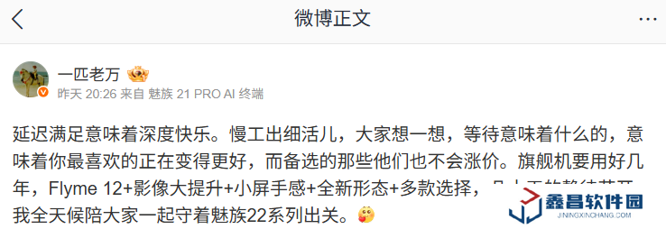 本站 5 月 6 日消息,星紀魅族集團市場品牌部總經理萬志強@一匹老萬 昨日發文透露了星紀魅族 22 系列手機部分特性。據稱,新機將預裝 Flyme 12 系統、采用小屏手感 + 全新形態設計,號稱“影像大提升”。