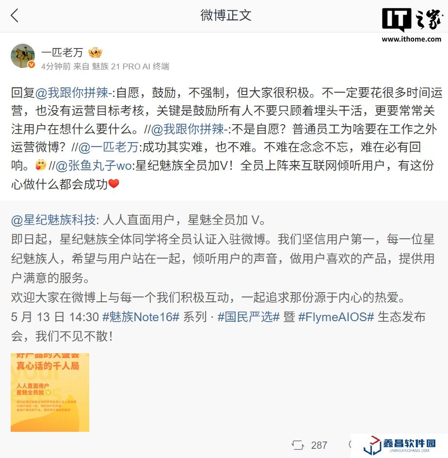 星紀魅族宣布全員認證入駐微博:自愿,鼓勵,不強制,但大家很積極