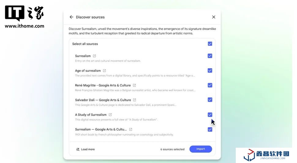 點擊該按鈕后,會出現一個帶有“您感興趣的是什么?”提示的文本框。用戶只需在文本框中描述自己想要查找的內容,越具體越好,然后點擊提交按鈕。NotebookLM 將在幾秒鐘內搜索數百個潛在的網絡資源,對它們進行分析,并根據用戶的話題篩選出最相關的資料。最終,它會整理出一份最多包含 10 個推薦資料的列表,并附上解釋其相關性的摘要。用戶可以勾選想要導入筆記本的資料,然后點擊導入按鈕。