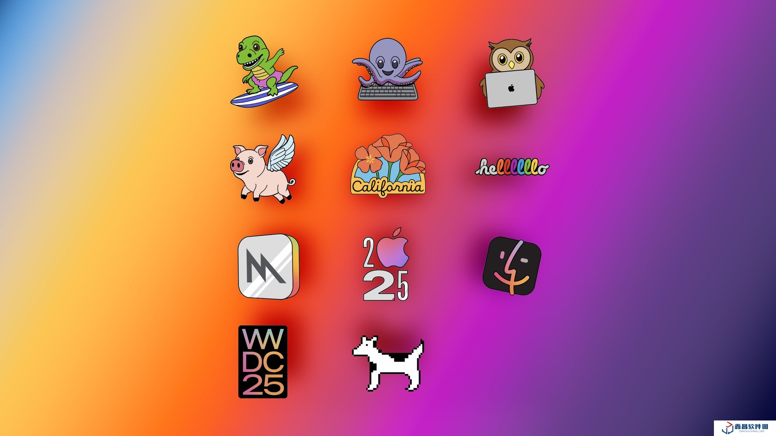 蘋(píng)果還延續(xù)往年慣例,在 Messages App 中推出新的 Genmoji 風(fēng)格貼紙,包括沖浪恐龍、敲鍵盤(pán)的章魚(yú)、飛天豬等動(dòng)畫(huà)設(shè)計(jì),還有色彩鮮艷的“Hello”貼紙和帶有加州花菱草元素的“California”貼紙。