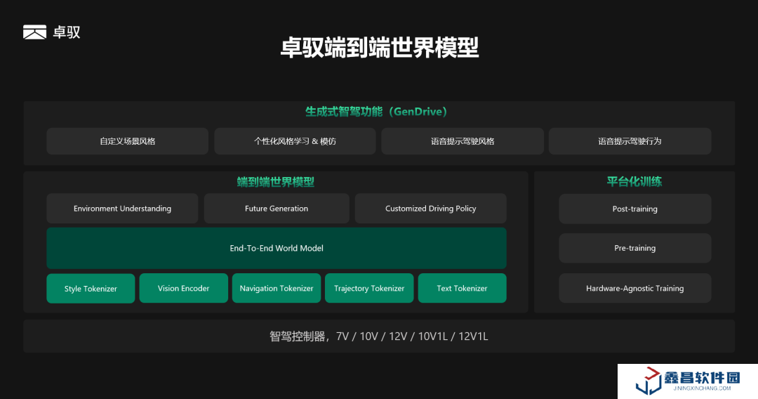卓馭的端到端世界模型整體架構(gòu),在最底層為硬件平臺,包括智駕控制器,可以適用英偉達(dá)的計算平臺,比如 DRIVE Orin / Thor SoC,并且可適配不同類型的傳感器配置。