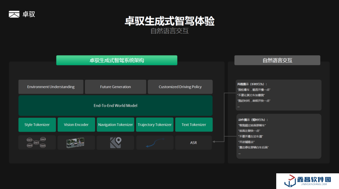 本站 3 月 19 日消息,卓馭 AI 首席陳曉智昨日在 NVIDIA GTC 2025 發(fā)表主題演講《基于端到端世界模型的生成式智駕體驗(yàn)》,分享了卓馭在端到端智能駕駛技術(shù)上的近期進(jìn)展,并公布了卓馭基于端到端世界模型的全新一代智能駕駛功能 —— 可支持自然語言交互的個性化生成式智駕方案 GenDrive。
