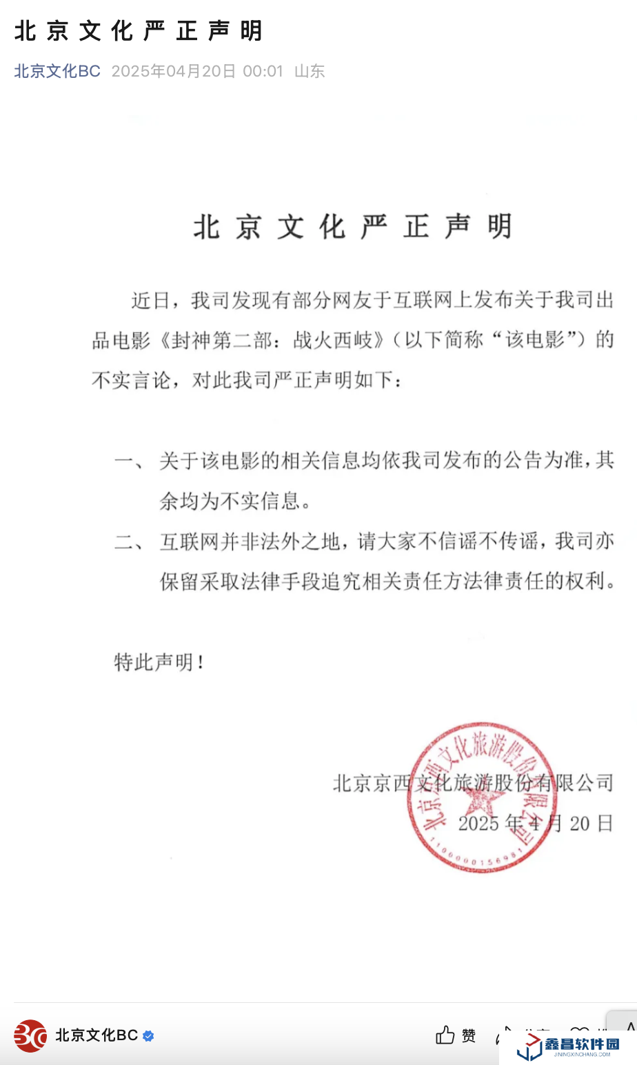 電影《封神第二部:戰(zhàn)火西岐》出品方北京文化發(fā)布聲明,稱“將追責(zé)網(wǎng)傳不實(shí)言論”