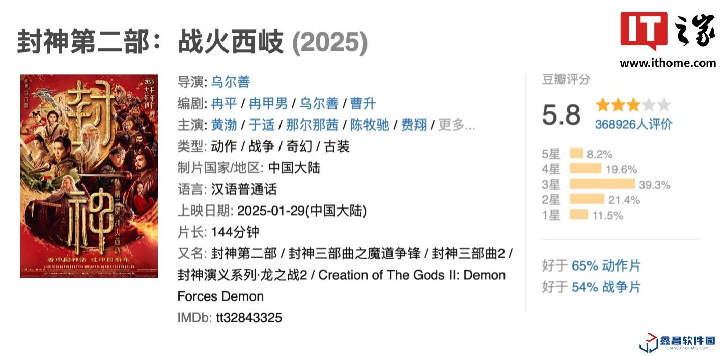 本站查詢獲悉,目前電影《封神第二部:戰(zhàn)火西岐》豆瓣評(píng)分 5.8,其中 8.2%的用戶給出5星評(píng)價(jià)、19.6%給出4星、39.3%給出3星、21.4%給出2星、11.5%給出1星。