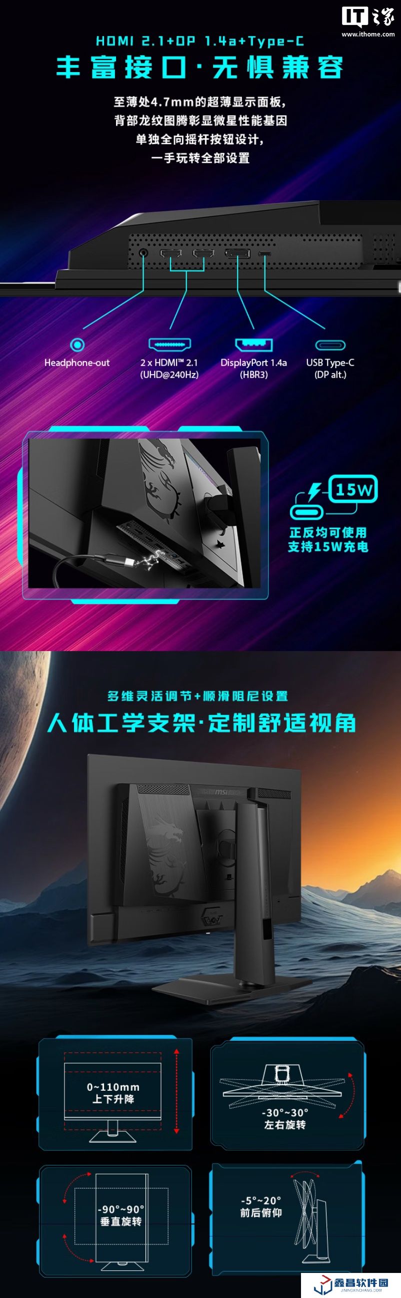 該機支架支持升降 / 傾斜 / 旋轉(zhuǎn),顯示器本體支持VESA 100x100mm壁掛,提供 2個 HDMI 2.1接口、1個 DP 1.4 接口、1個 USB-C 15W接口。