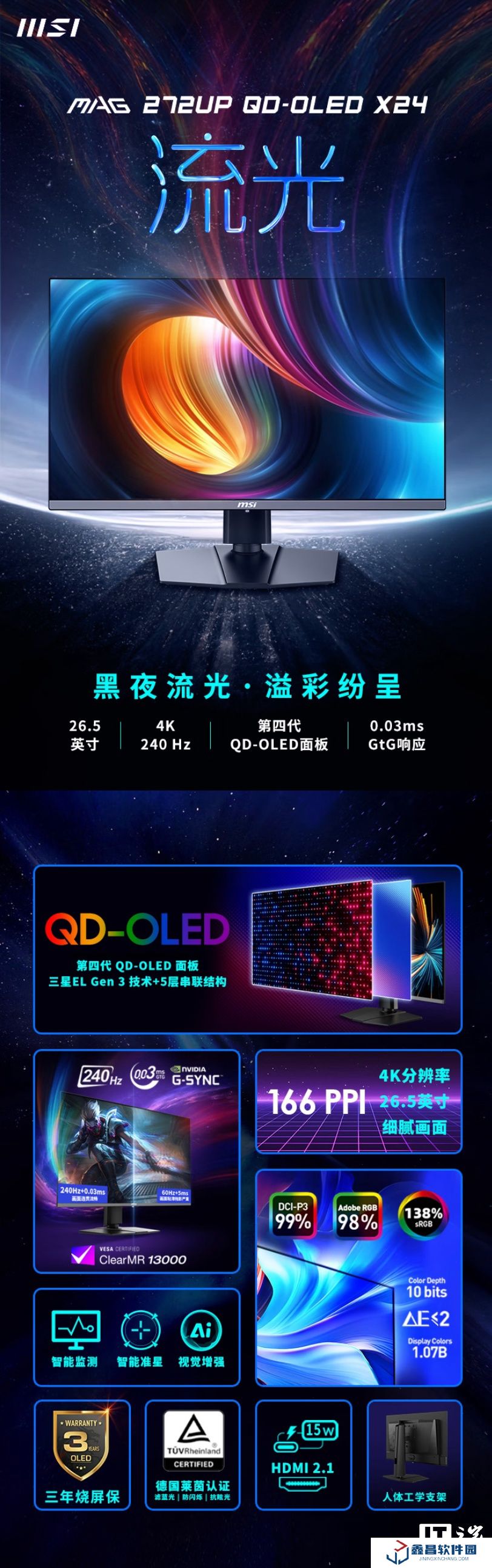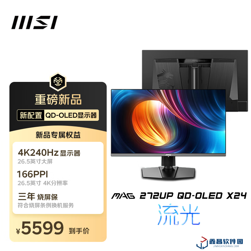 微星“MAG 272UP QD-OLED X24”26.5 英寸顯示器首銷:三星 4K 240Hz 面板,5599 元