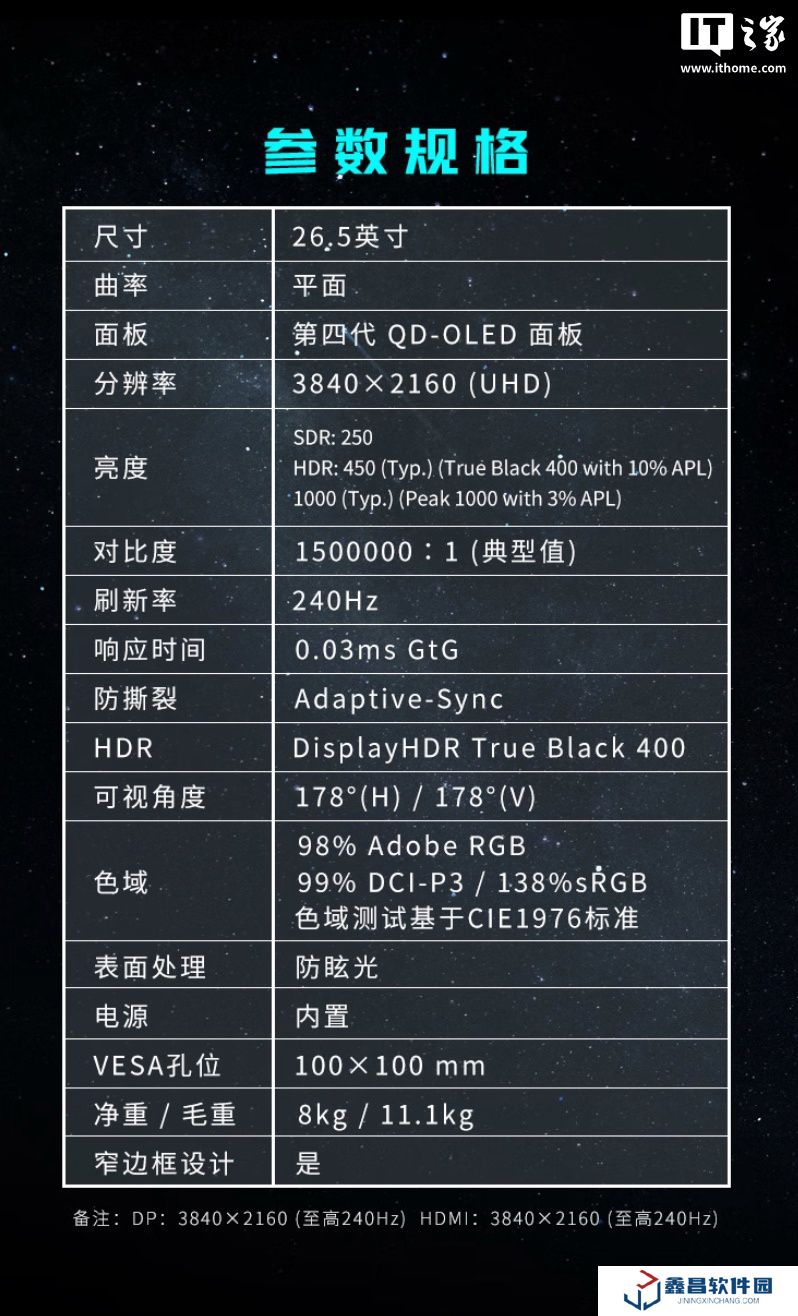 該機應用3840x2160分辨率240Hz QD-OLED三星四代面板,提供 150 萬:1動態(tài)對比度、0.03ms GtG相應速度、1000尼特峰值亮度,顯示器支持原生10-Bit色彩,覆蓋98% Adobe RGB和99% DCI-P3色域。