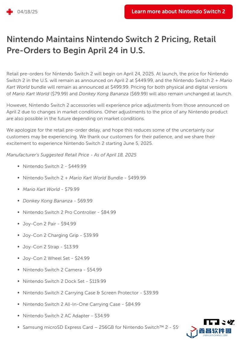 - 任天堂美國:4 月 24 日重開 Switch 2 預定,主機 / 游戲價格不變、部分配件漲價