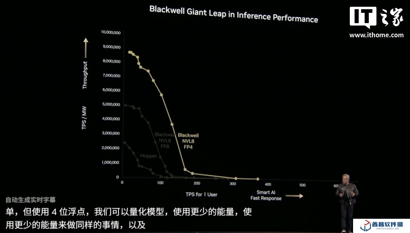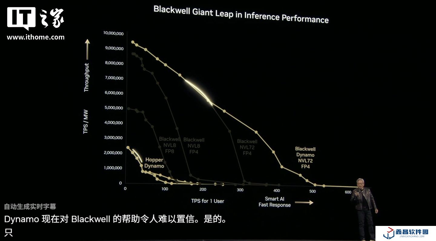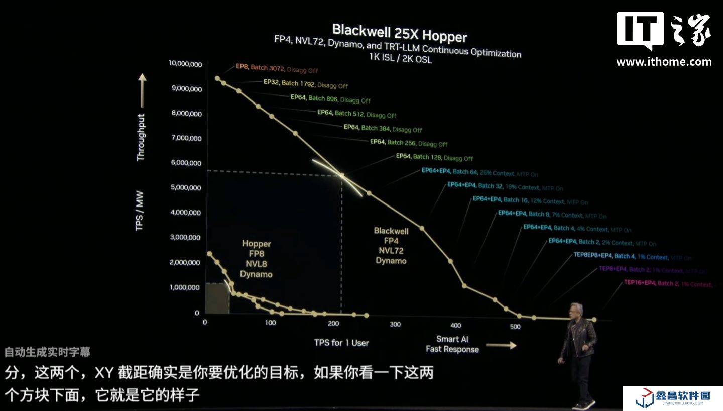 黃仁勛展示了一張關(guān)于推理的圖表,X 軸顯示用戶每秒的 Token 數(shù),Y 軸顯示工廠每秒的 Token 數(shù)。