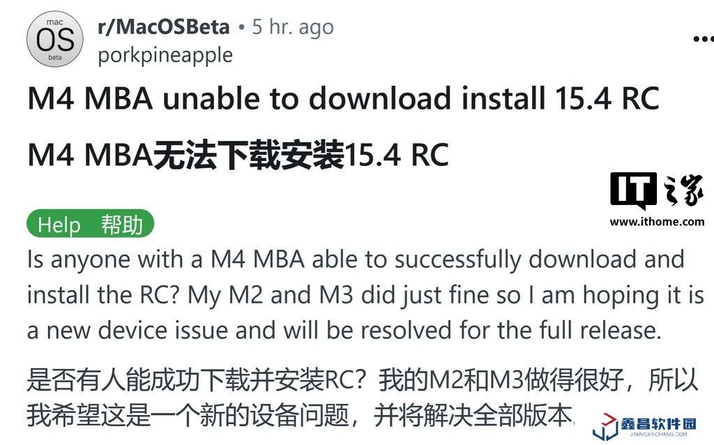本站 3 月 25 日消息,科技媒體 MacRumors 今天(3 月 25 日)發布博文,報道稱 M4 MacBook Air 以及 M4 Max / M3 Ultra 芯片的 Mac Studio 無法安裝 macOS 15.4 RC 版本。