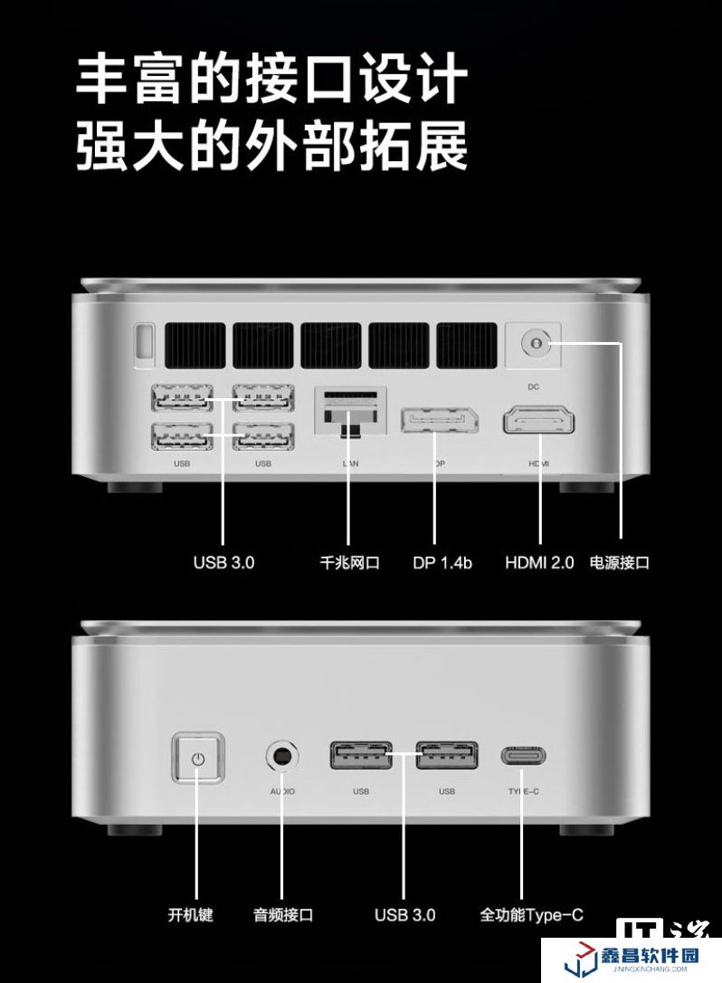 該機支持Wi-Fi 5 和藍牙4.2,正面提供2個 USB-A 3.0接口、1個“全功能”USB-C接口、1個 3.5mm音頻接口;后側配備4個USB-A 3.0接口、1個 RJ45網口、1個 DP 1.4接口、1個 HDMI 2.0接口。