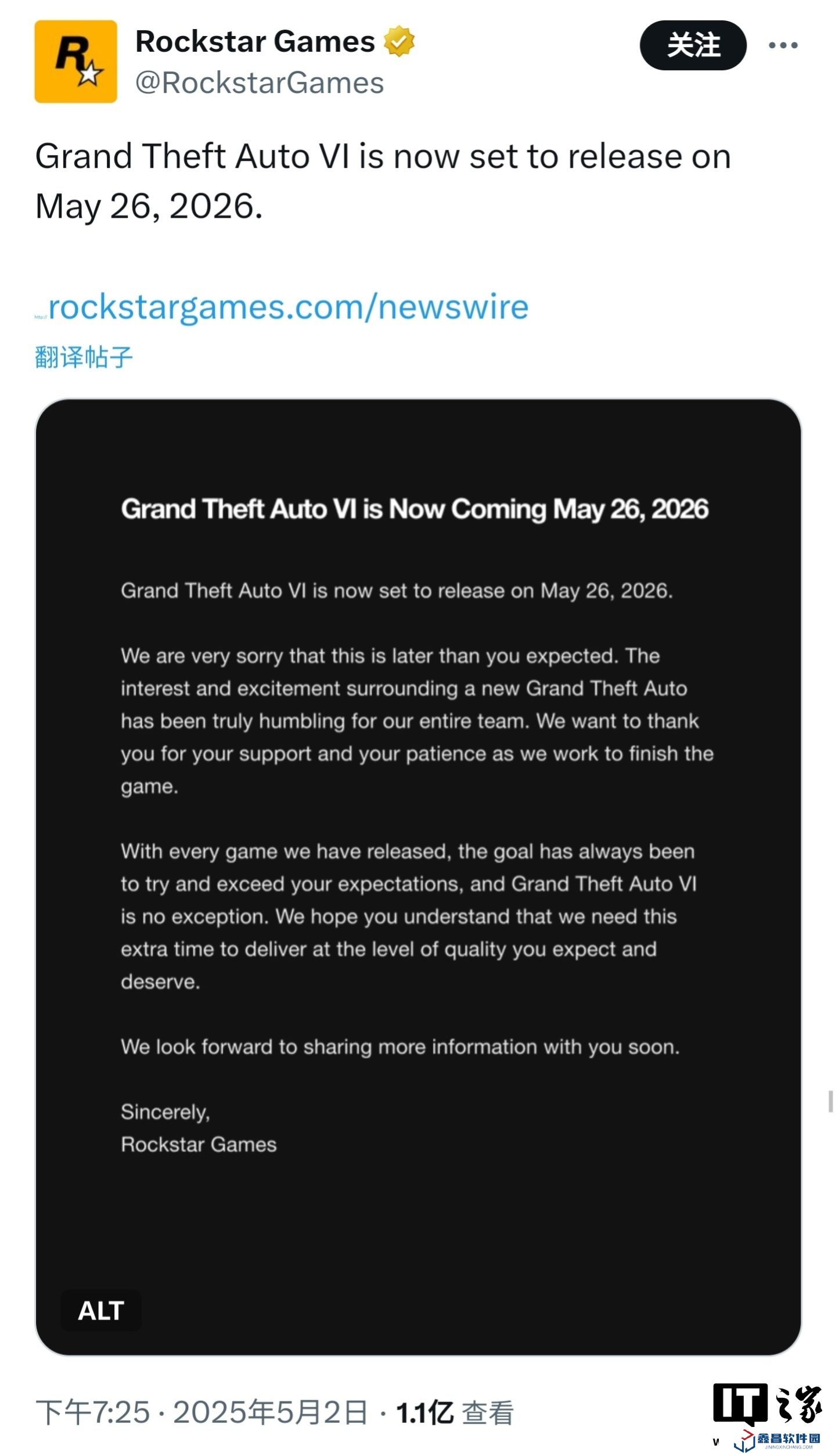 本站 5 月 5 日消息,Rockstar Games 于 5 月 2 日宣布,《GTA6》發售日將從原定的今年秋季推遲至 2026 年 5 月 26 日。這一消息迅速引起全球玩家熱議,現在該推文已經突破 1 億次瀏覽,累計收獲超過 5.5 萬條評論。