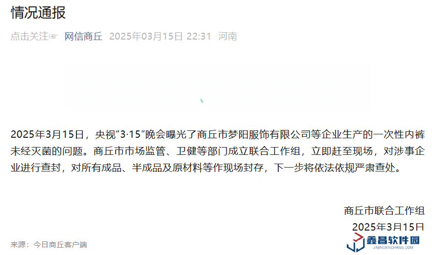 2025 年 3 月 15 日,央視“3?15”晚會曝光了商丘市夢陽服飾有限公司等企業(yè)生產(chǎn)的一次性內(nèi)褲未經(jīng)滅菌的問題。商丘市市場監(jiān)管、衛(wèi)健等部門成立聯(lián)合工作組,立即趕至現(xiàn)場,對涉事企業(yè)進行查封,對所有成品、半成品及原材料等作現(xiàn)場封存,下一步將依法依規(guī)嚴肅查處。