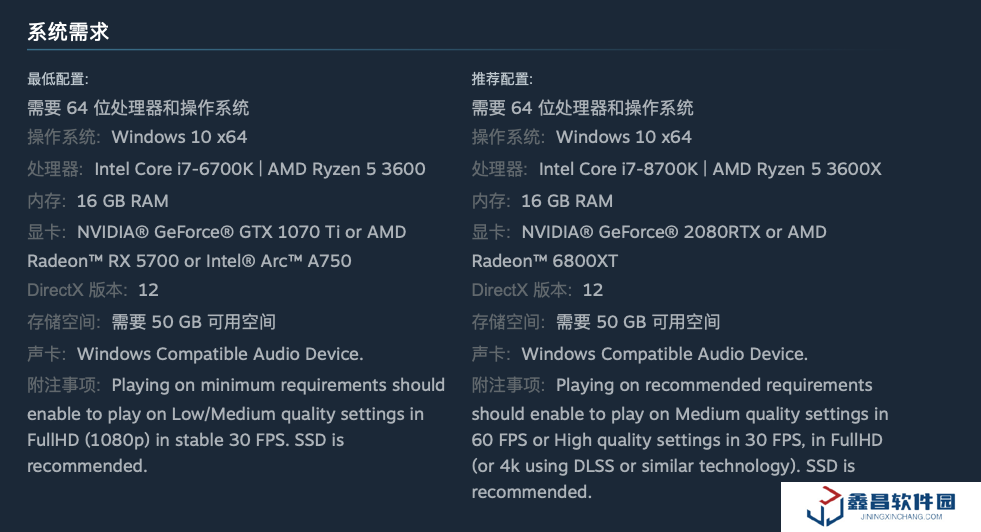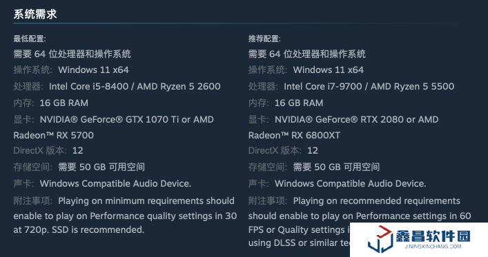 附注事項:滿足推薦配置時,游戲可在性能模式下以 60 幀,1080P 畫質運行;或在畫質模式下以 30 幀運行(借助 DLSS 等技術可達 4K 分辨率)。需配備固態(tài)硬盤。