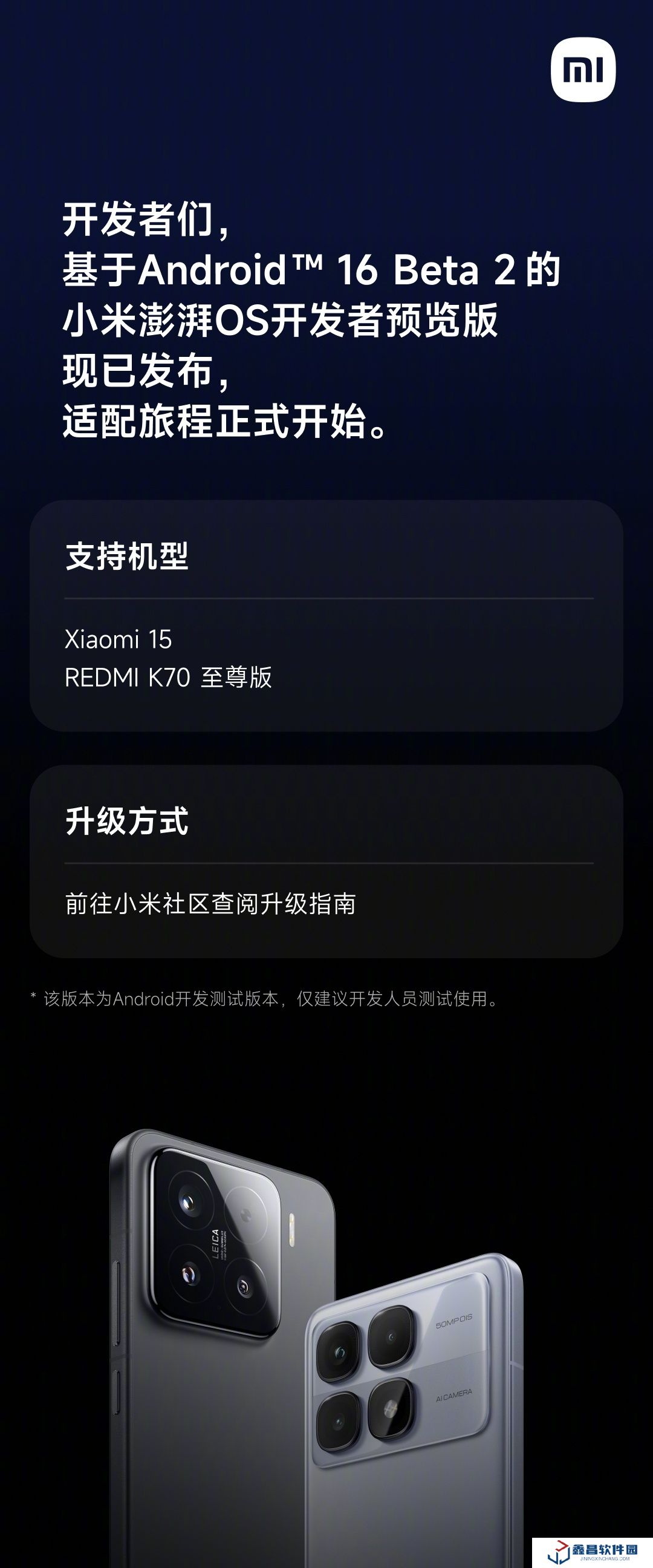 本站 4 月 8 日消息,小米澎湃OS發文,宣布基于安卓 16 Beta 2 的小米澎湃 OS 開發者預覽版現已發布,即日起,開發者們可使用小米 15、REDMI K70 至尊版嘗鮮適配。
