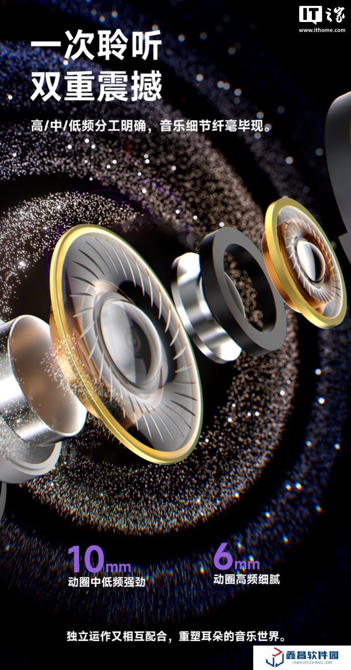 據介紹,這款耳機擁有“Hi-Res Wireless 金標認證”,配備6mm鍍鈦高頻單元+ 10mm復合中低頻單元,支持 -47dB降噪。