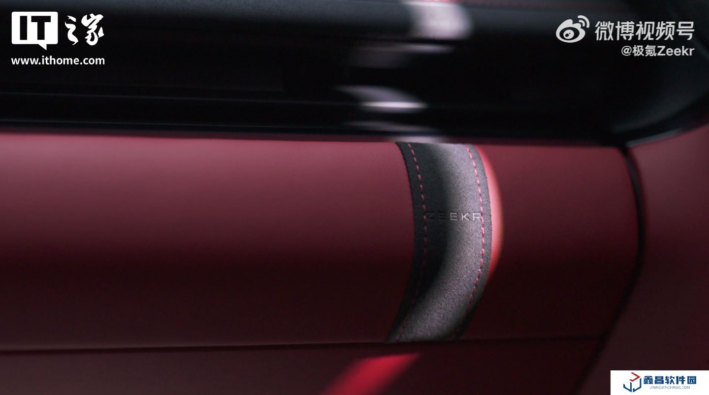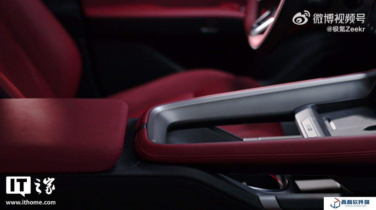 這款紅黑版本內飾整體運動感突出,車輛副駕帶有黑色麂皮材質 + 紅色縫線的“ZEEKR”標識裝飾。此外車輛的副儀表臺外側、中央扶手、座椅也均使用了紅色皮質材料包覆。