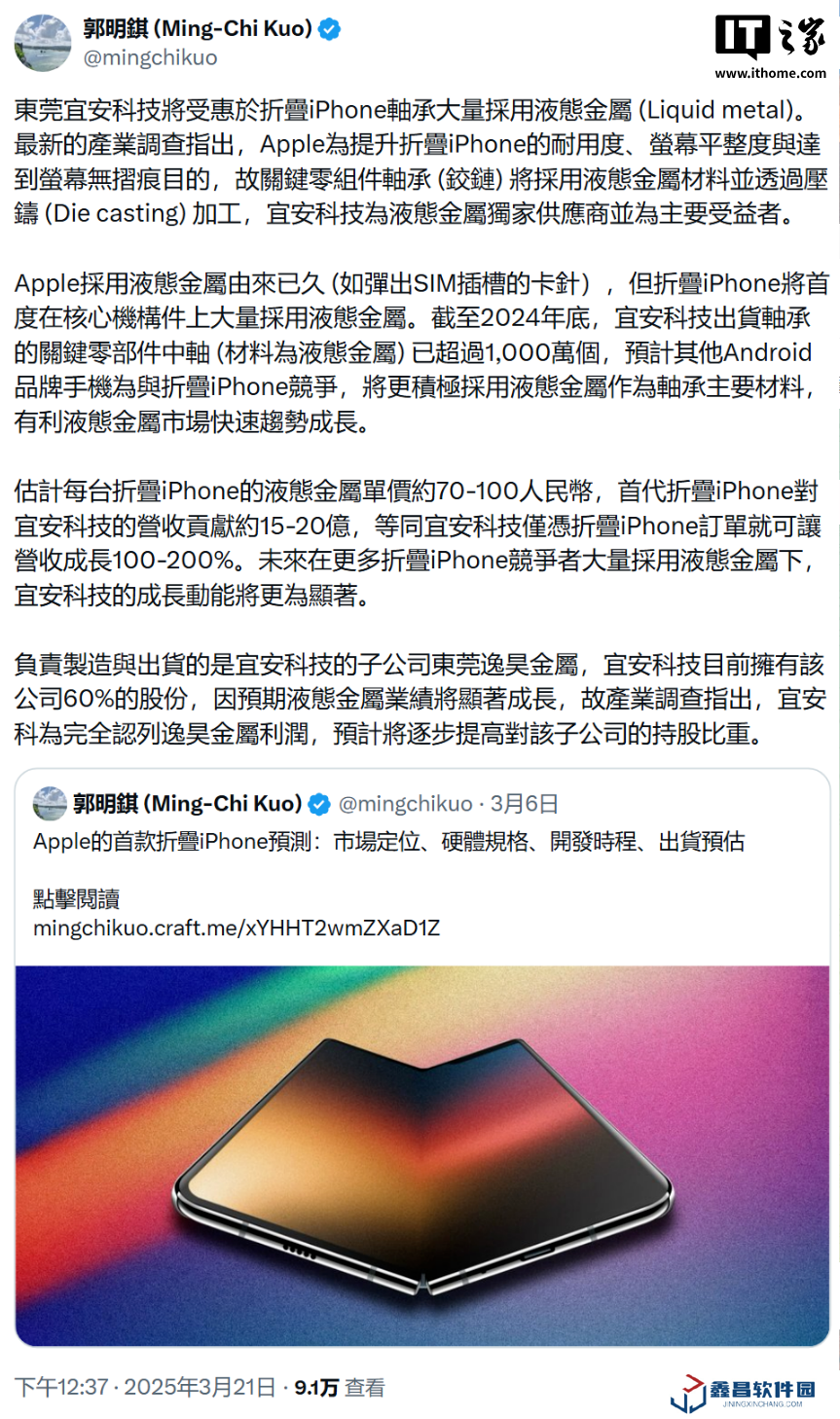 分析師郭明錤昨日(3 月 21 日)發文稱,蘋果公司為提升折疊 iPhone 的耐用性、屏幕平整度以及實現屏幕無折痕效果,決定在其關鍵零組件 —— 軸承(鉸鏈)中大量采用液態金屬材料,并通過壓鑄工藝進行加工。