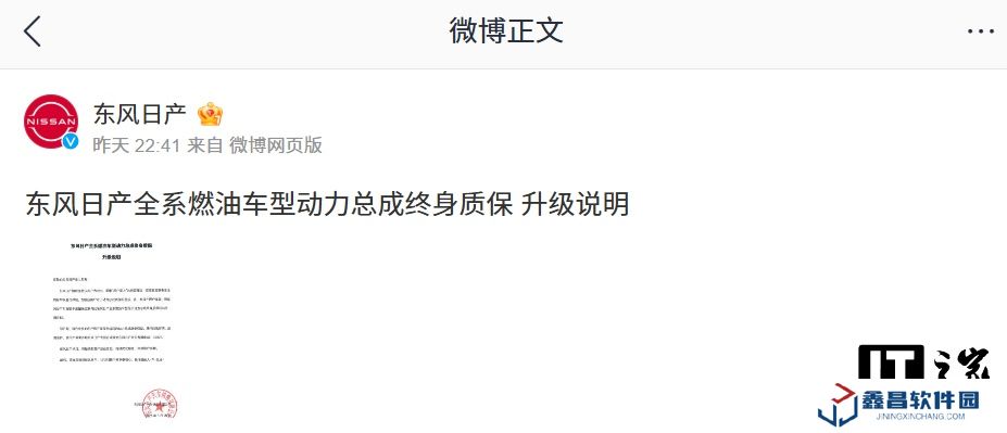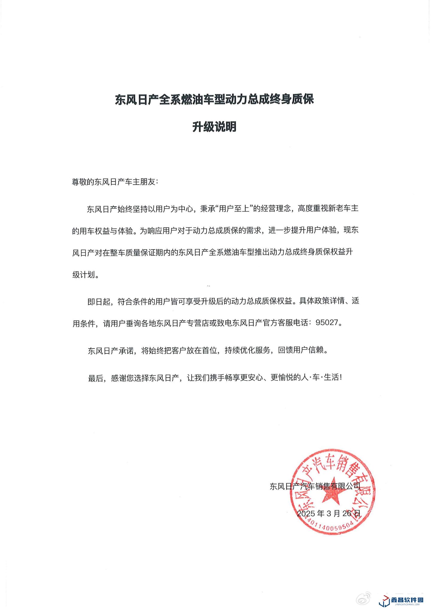 本站 3 月 27 日消息,東風日產(chǎn)官方微博昨日晚發(fā)布升級說明,宣布東風日產(chǎn)全系燃油車型動力總成升級終身質(zhì)保。