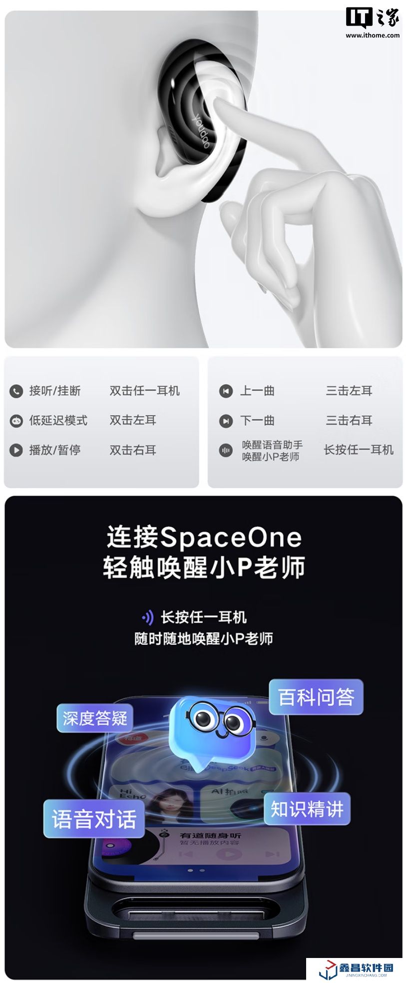 此外,Youdao OpenEar 配有藍牙 5.4 芯片,支持單手手勢操控,還可連接有道學習硬件SpaceOne 喚醒小 P 老師。