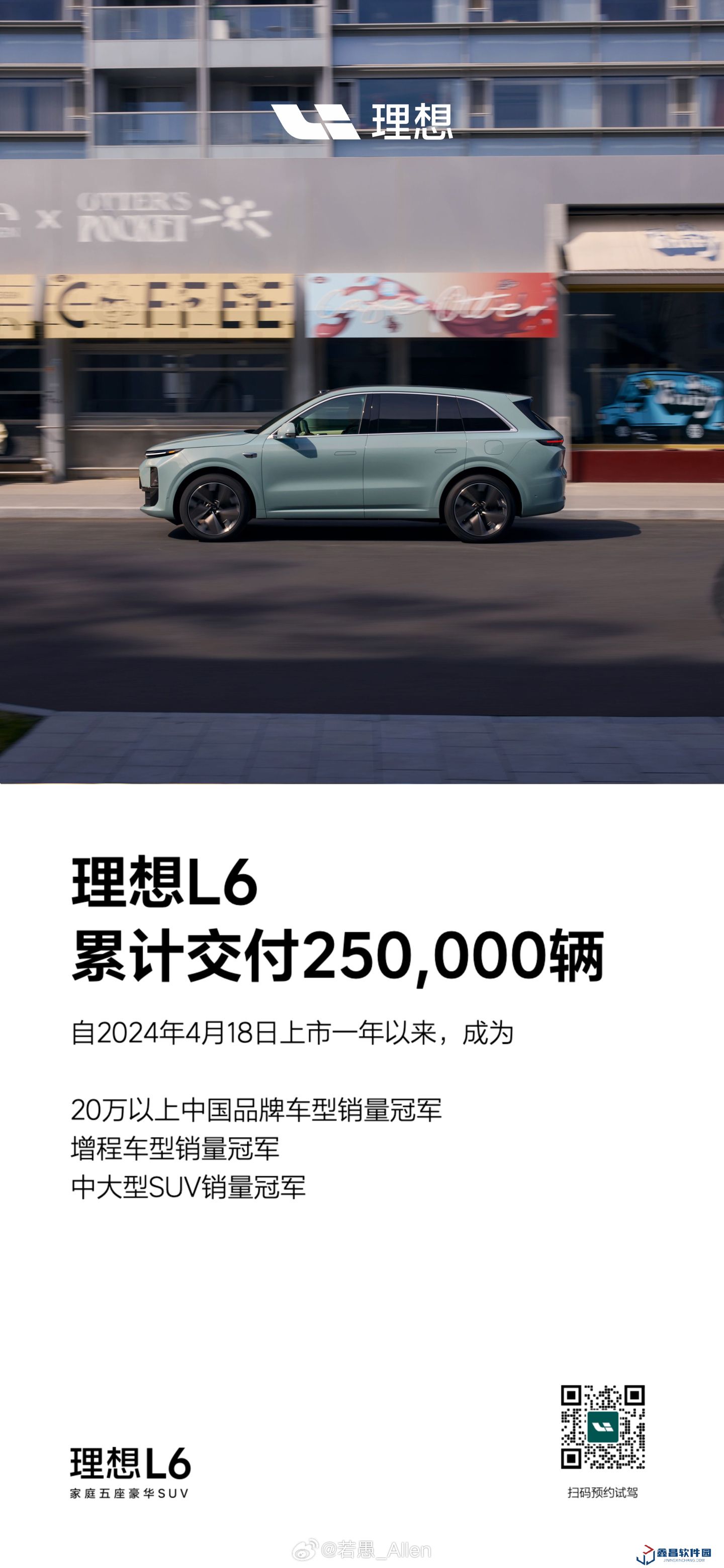 本站 4 月 26 日消息,理想汽車今晚宣布,理想 L6 累計交付突破 25 萬輛。這款車型于去年 4 月 18 日上市,定位家庭豪華五座 SUV。