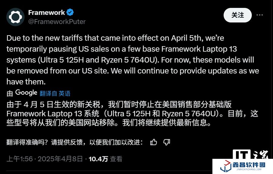 本站 4 月 8 日消息,美國電腦制造商 Framework 宣布,由于特朗普**于 4 月 5 日生效的關稅政策,將“暫時暫停”在美國銷售部分筆記本電腦。