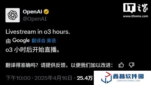 本站 4 月 16 日消息,OpenAI 今日晚間 10 點(diǎn)發(fā)布預(yù)告,將在o3 小時(shí)后進(jìn)行直播。從官方特別用詞來看,預(yù)計(jì)將發(fā)布滿血版 o3 推理模型,時(shí)間為凌晨 1 點(diǎn)。
