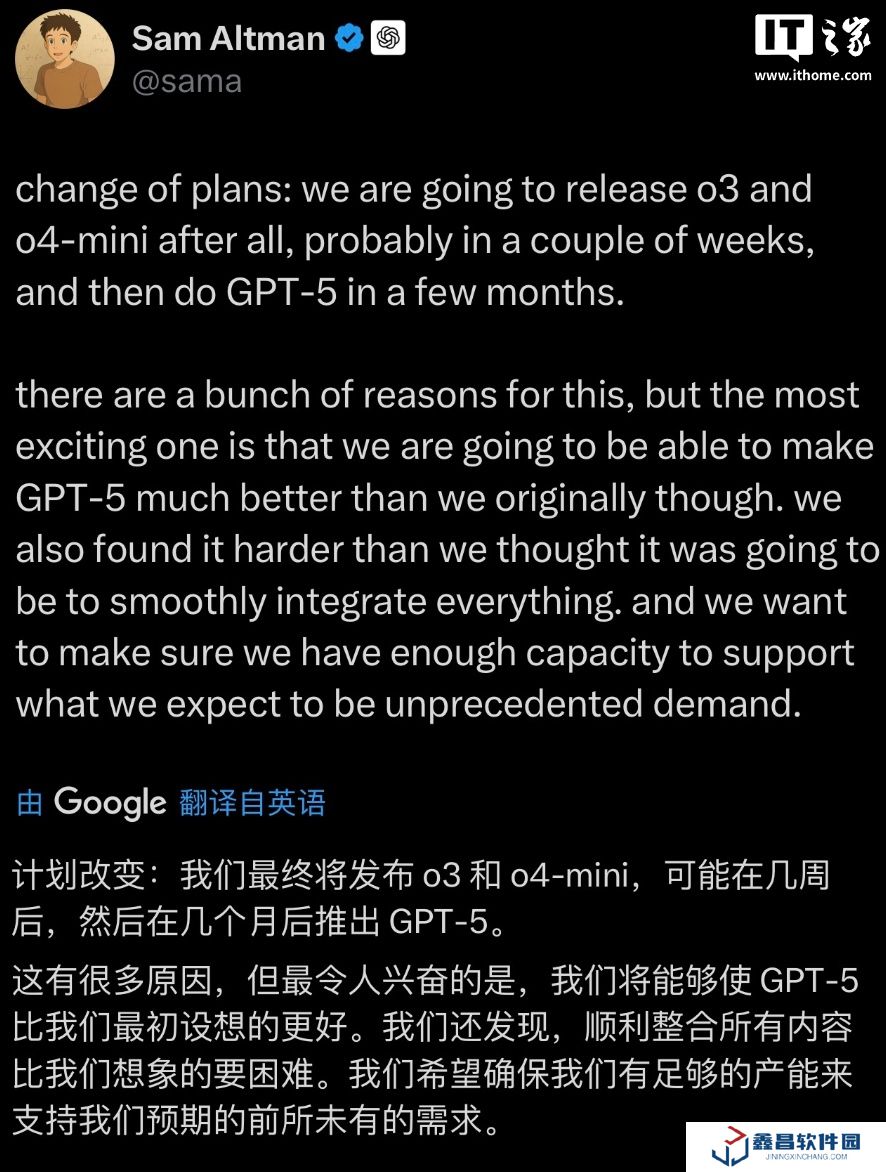OpenAI CEO 奧爾特曼本月初在社交平臺(tái) X 上發(fā)文稱,可能在數(shù)周內(nèi)發(fā)布 o3 和 o4-mini,未來幾月內(nèi)發(fā)布 GPT-5。