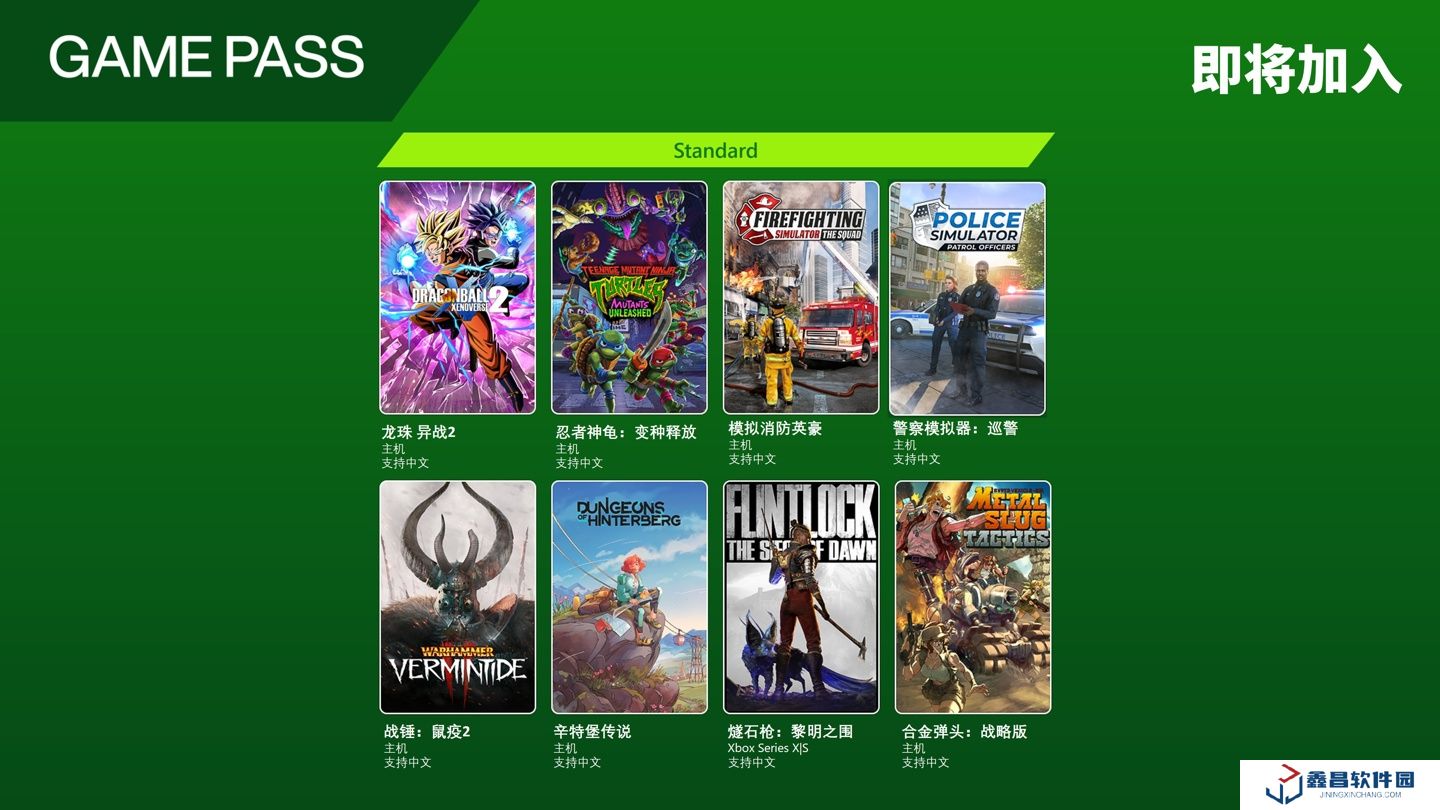 Game Pass Standard:《龍珠異戰 2》、《忍者神龜:變種釋放》、《模擬消防英豪》、《**模擬器:巡警》、《戰錘:鼠疫 2》、《辛特堡傳說》、《燧石槍:黎明之圍》、《合金彈頭:戰略版》