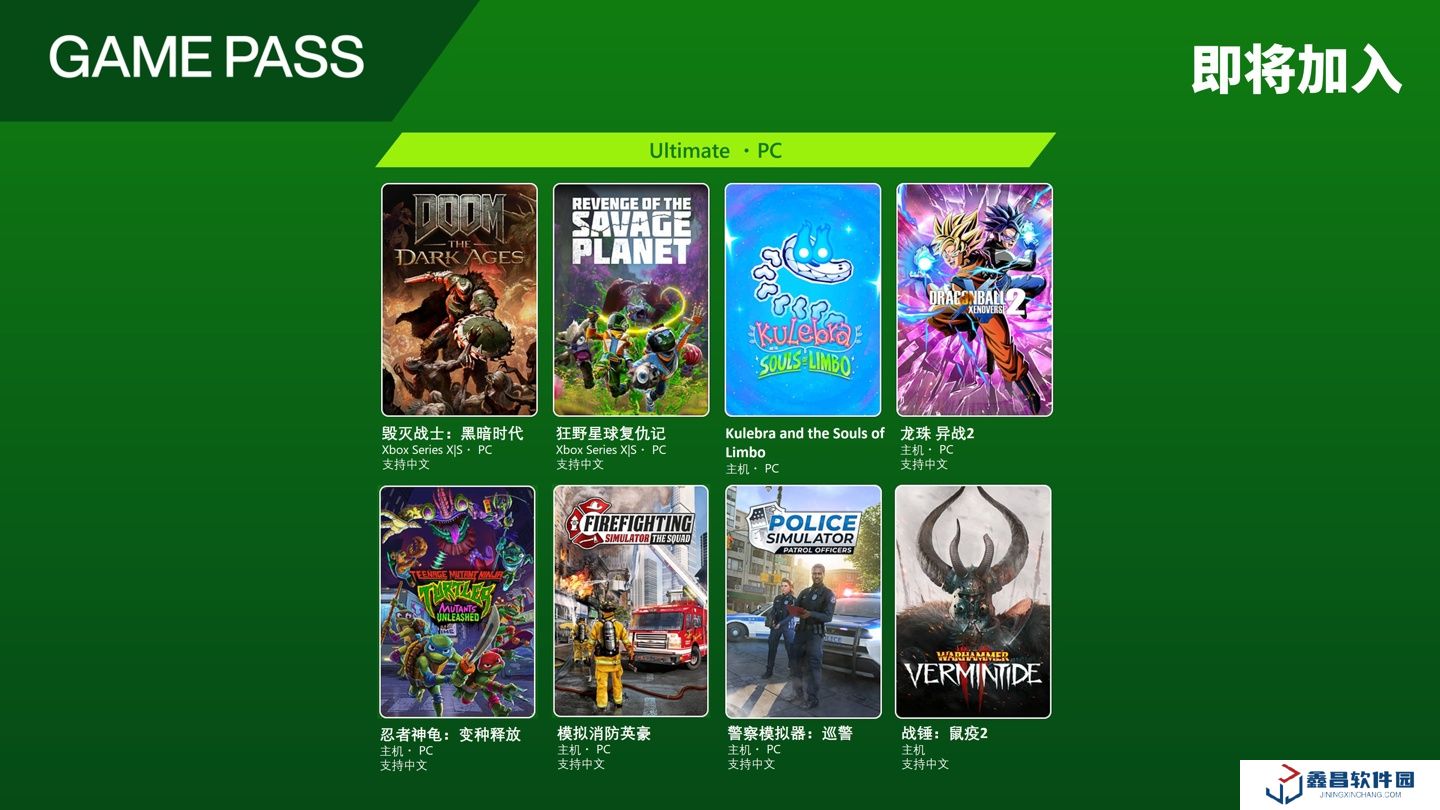 Game Pass Ultimate?PC:《毀滅戰士:黑暗時代》、《狂野星球復仇記》、《Kulebra and the Souls of Limbo》、《龍珠異戰 2》、《忍者神龜:變種釋放》、《模擬消防英豪》、《**模擬器:巡警》