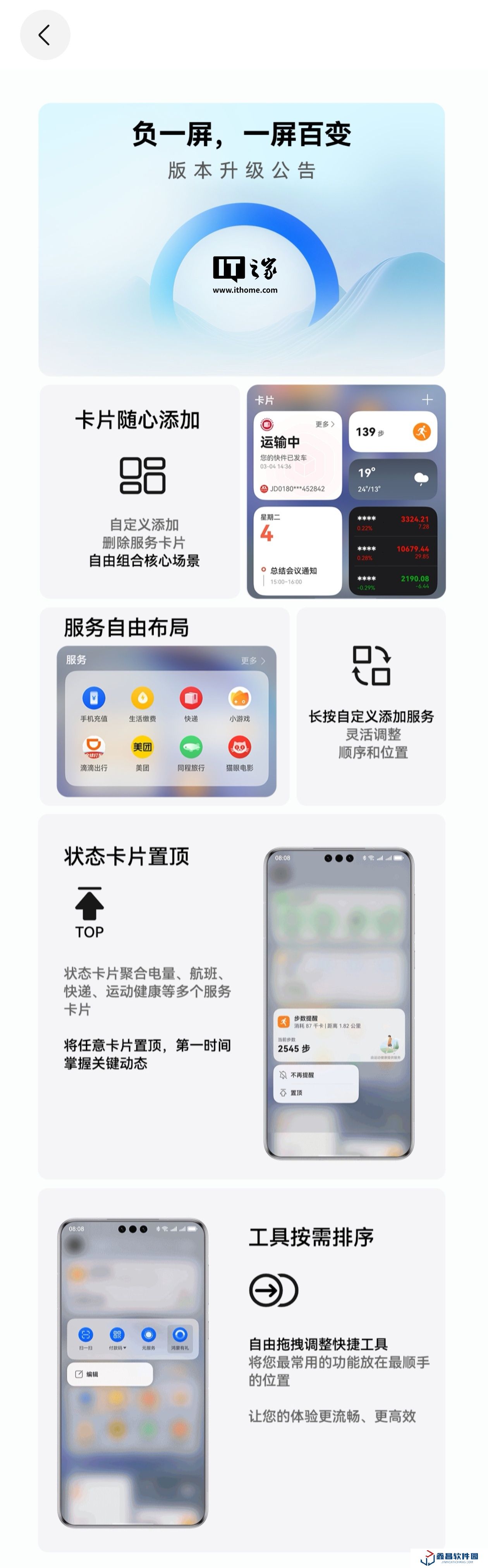 升級至“135”版本的機型已支持新版本“智慧助手?今天”App 的部分功能,包括:卡片添加、服務自由布局、狀態卡片置頂、工具按需排序等功能。遺憾的是,目前 12306 尚未完成負一屏的接入(該功能已做預告,預計后續版本支持),暫時僅支持綁定航旅縱橫。