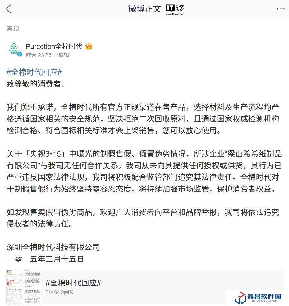 關于「央視 3?15」中曝光的制假售假、假冒偽劣情況,所涉企業“梁山希希紙制品有限公司”與我司無任何合作關系,我司從未向其提供任何授權或供貨,其行為已嚴重違反國家法律法規,我司將積極配合監管部門追究其法律責任。全棉時代對于制假售假行為始終堅持零容忍態度,將持續加強市場監管,保護消費者權益。