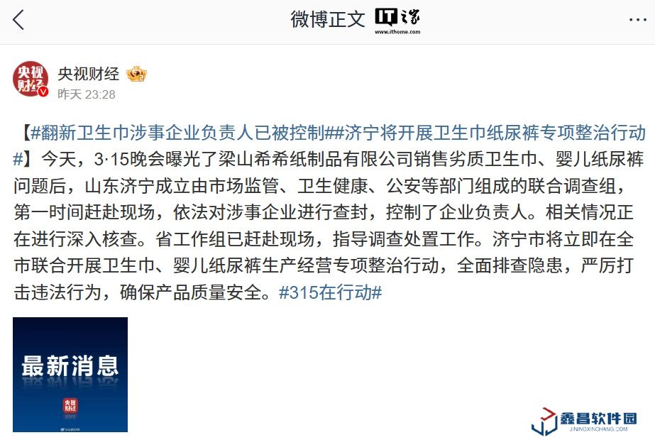 另據央視財經報道,3?15 晚會曝光了梁山希希紙制品有限公司銷售劣質衛生巾、嬰兒紙尿褲問題后,山東濟寧成立由市場監管、衛生健康、公安等部門組成的聯合調查組,第一時間趕赴現場,依法對涉事企業進行查封,控制了企業負責人,相關情況正在進行深入核查。