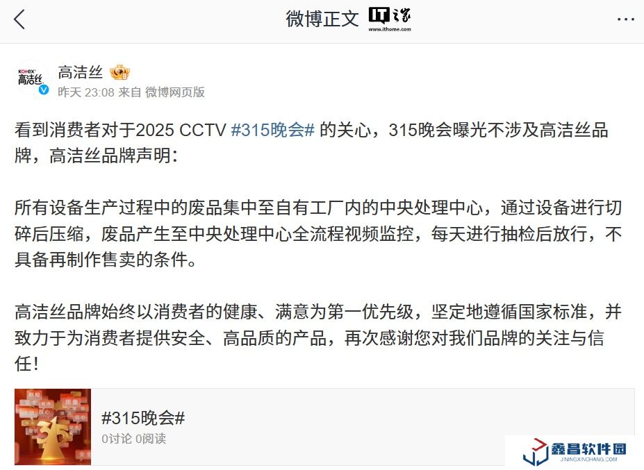 看到消費者對于 2025 CCTV 315 晚會的關心,315 晚會曝光不涉及高潔絲品牌,高潔絲品牌聲明: