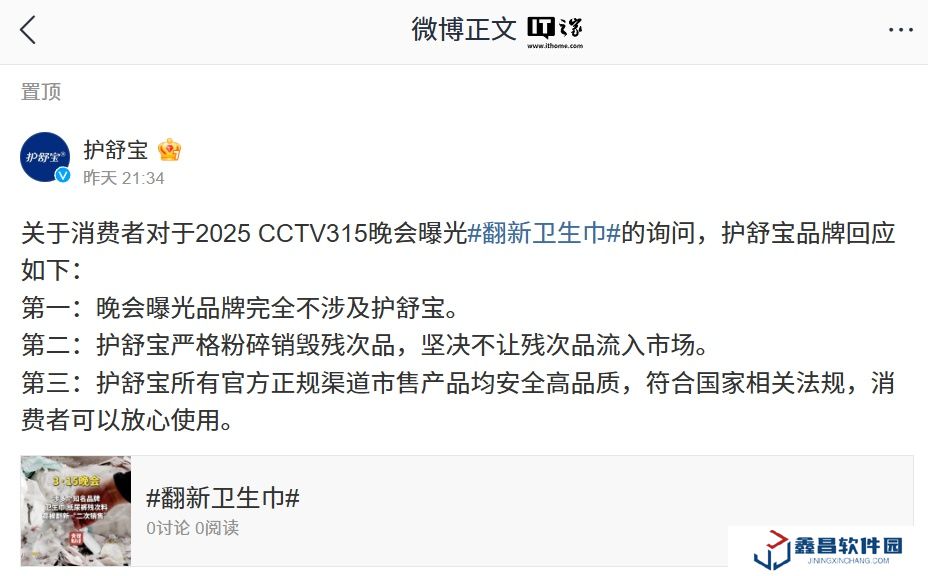 關于消費者對于 2025 CCTV 315 晚會曝光翻新衛生巾的詢問,護舒寶品牌回應如下: