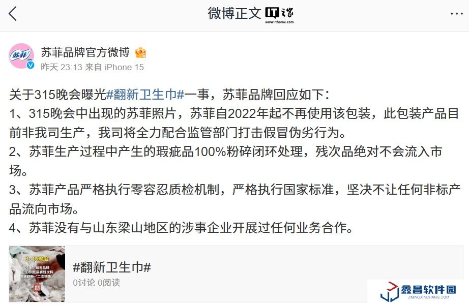 關于 315 晚會曝光翻新衛生巾一事,蘇菲品牌回應如下: