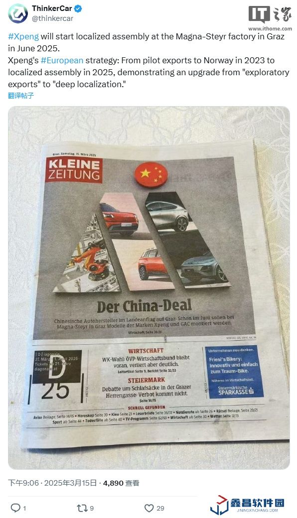 本站 3 月 17 日消息,德國媒體《克萊恩報》3 月 15 日稱,小鵬、廣汽將從 6 月開始在奧地利格拉茨的麥格納斯太爾(Magna Steyr)工廠進行生產,初期階段只有SKD 半散件方式組裝的特殊車型。
