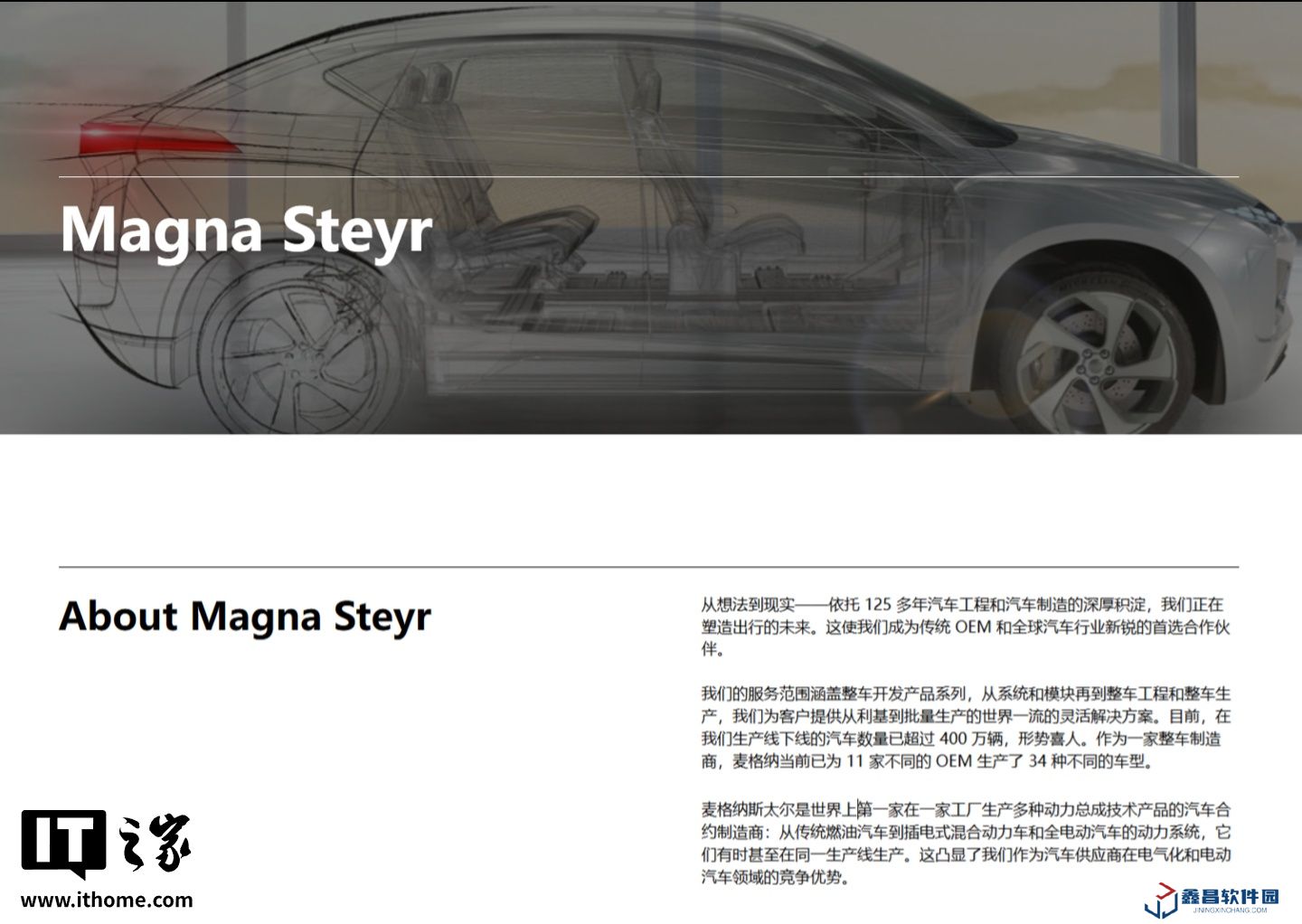 本站查詢獲悉,麥格納斯太爾原屬斯太爾-戴姆勒-普赫,現是麥格納的子公司,是全球汽車業最大的合約制造商。作為一家整車制造商,麥格納至少已為 11 家不同的 OEM 廠商生產了 34 種不同的車型(如梅賽德斯-奔馳、奧迪、菲亞特和標致汽車)。