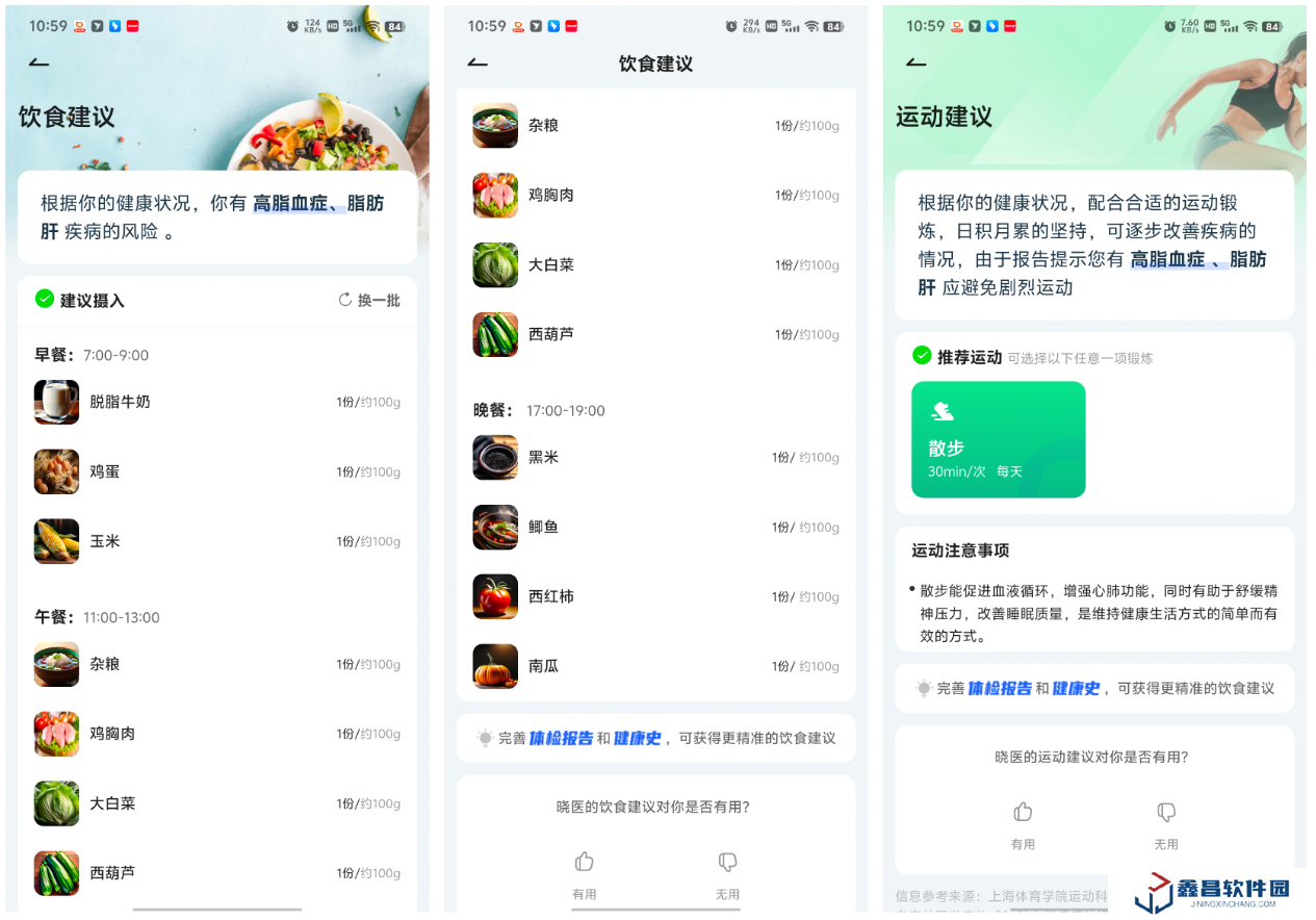 不僅如此,訊飛曉醫(yī)還會(huì)根據(jù)你填寫(xiě)的健康史信息主動(dòng)幫你生成一份飲食建議,比如小編有高脂血癥、脂肪肝,它就幫我生成了對(duì)應(yīng)的健康飲食計(jì)劃,早餐、午餐、晚餐適合吃什么都安排得好好的。當(dāng)然,除了飲食計(jì)劃,訊飛曉醫(yī)還可以給你提供對(duì)應(yīng)的運(yùn)動(dòng)建議,包括適合的運(yùn)動(dòng)、運(yùn)動(dòng)中需要注意的事項(xiàng)等等。