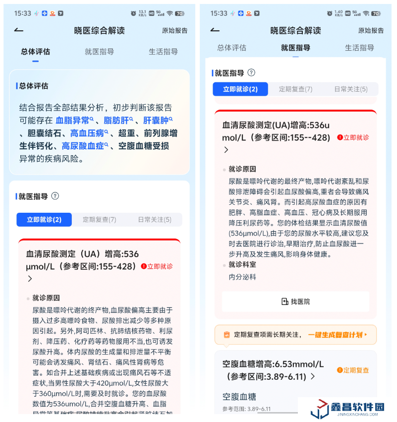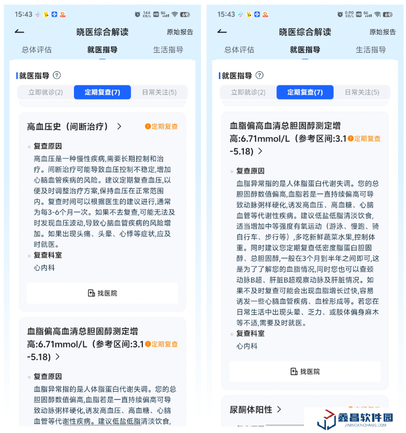 解讀完成后,可以看到訊飛曉醫(yī)給出的解讀內(nèi)容非常豐富,先是在總體評(píng)估中準(zhǔn)確判斷出報(bào)告中純?cè)诘母黜?xiàng)異常指標(biāo),然后又針對(duì)每一項(xiàng)異常指標(biāo)進(jìn)行醫(yī)學(xué)原理解讀和就醫(yī)指導(dǎo),在就醫(yī)指導(dǎo)中又根據(jù)異常項(xiàng)目的嚴(yán)重情況區(qū)分了“立即就診”、“定期復(fù)查”、“日常關(guān)注”三個(gè)類別,由于這部分內(nèi)容很詳細(xì),小編截取其中片段供大家參考,不難發(fā)現(xiàn)呈現(xiàn)的方式很直觀、細(xì)致,甚至指明了復(fù)查科室。