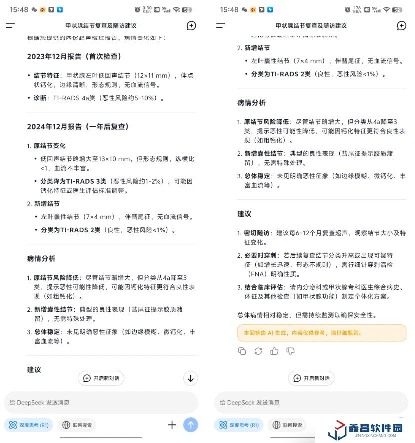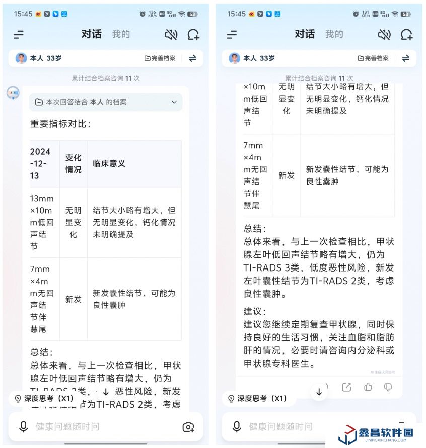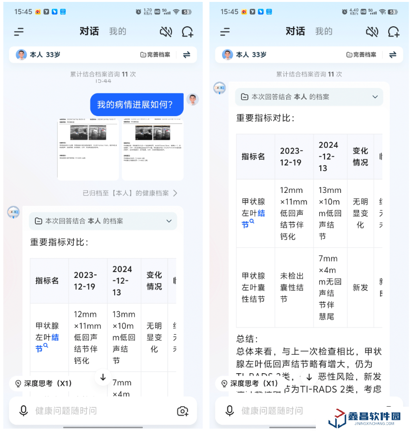 最后,小編上傳了兩年間不同時(shí)間拍攝的兩張甲狀腺彩超報(bào)告單照片,考驗(yàn)大模型能否根據(jù)多報(bào)告單進(jìn)行時(shí)序?qū)Ρ冉庾x。