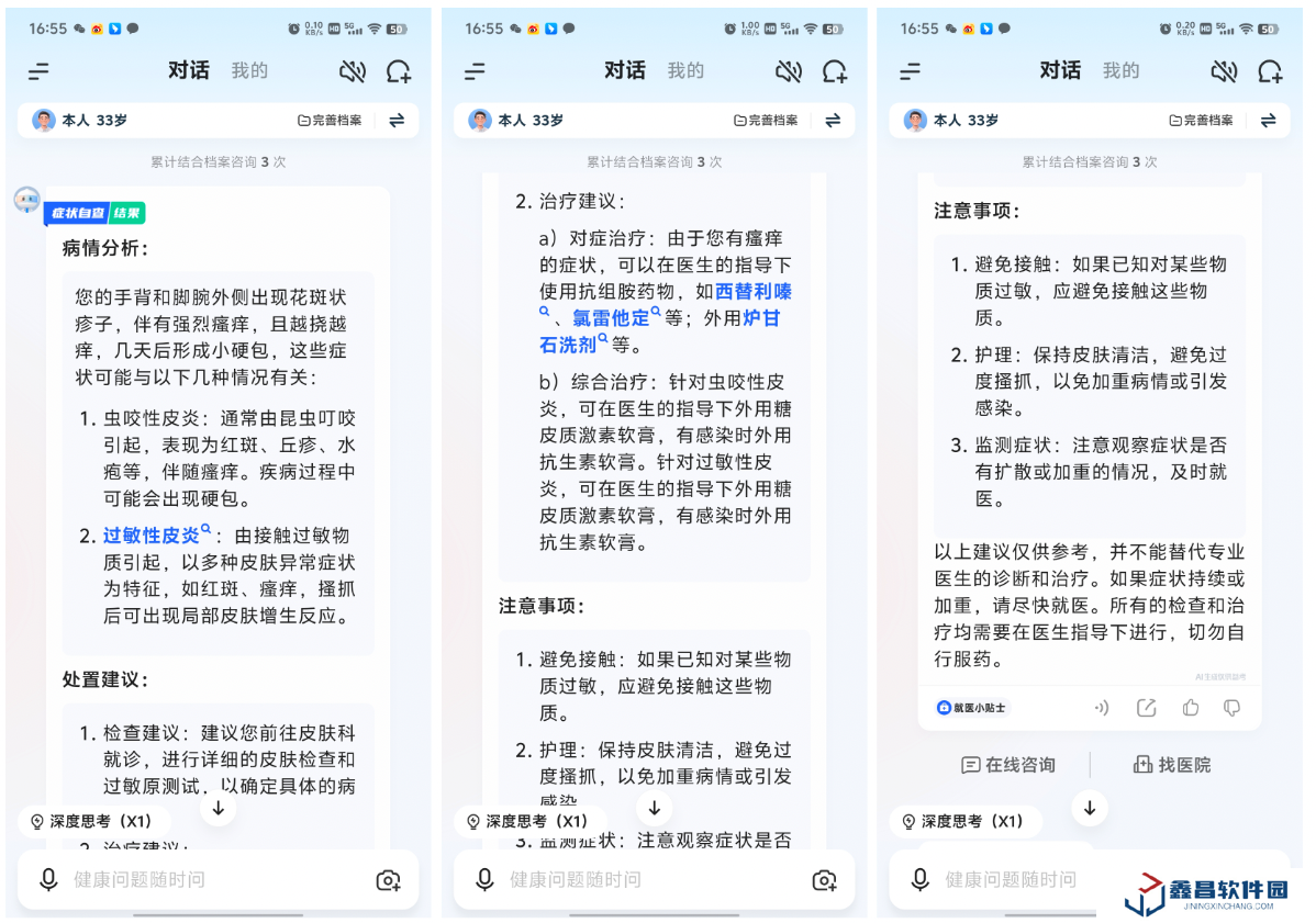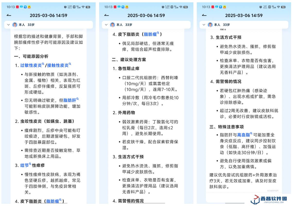 在開(kāi)啟大模型 X1 的情況下,你可以看到訊飛曉醫(yī)在思考中是如何根據(jù)小編的病史情況和問(wèn)題中描述的癥狀一步步排除各種因素,分析可能導(dǎo)致手部出現(xiàn)疹子的原因的,整個(gè)過(guò)程思路很是清晰,而在處理建議方面,也考慮了各種適合或者不適合的處理方式。