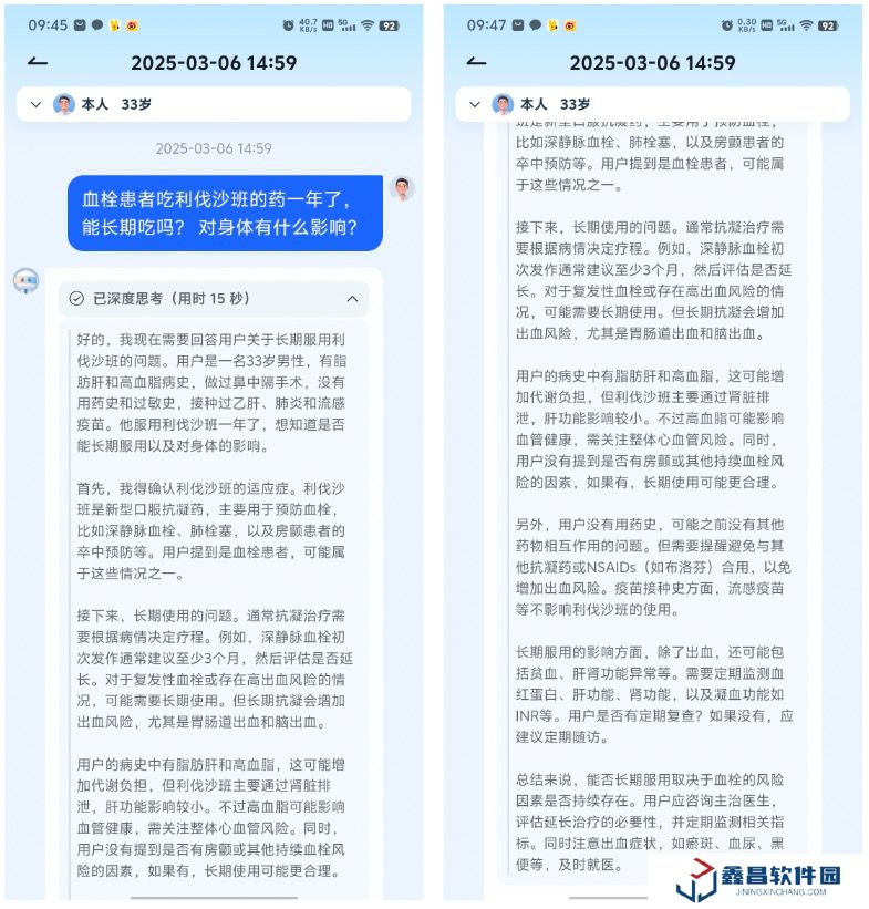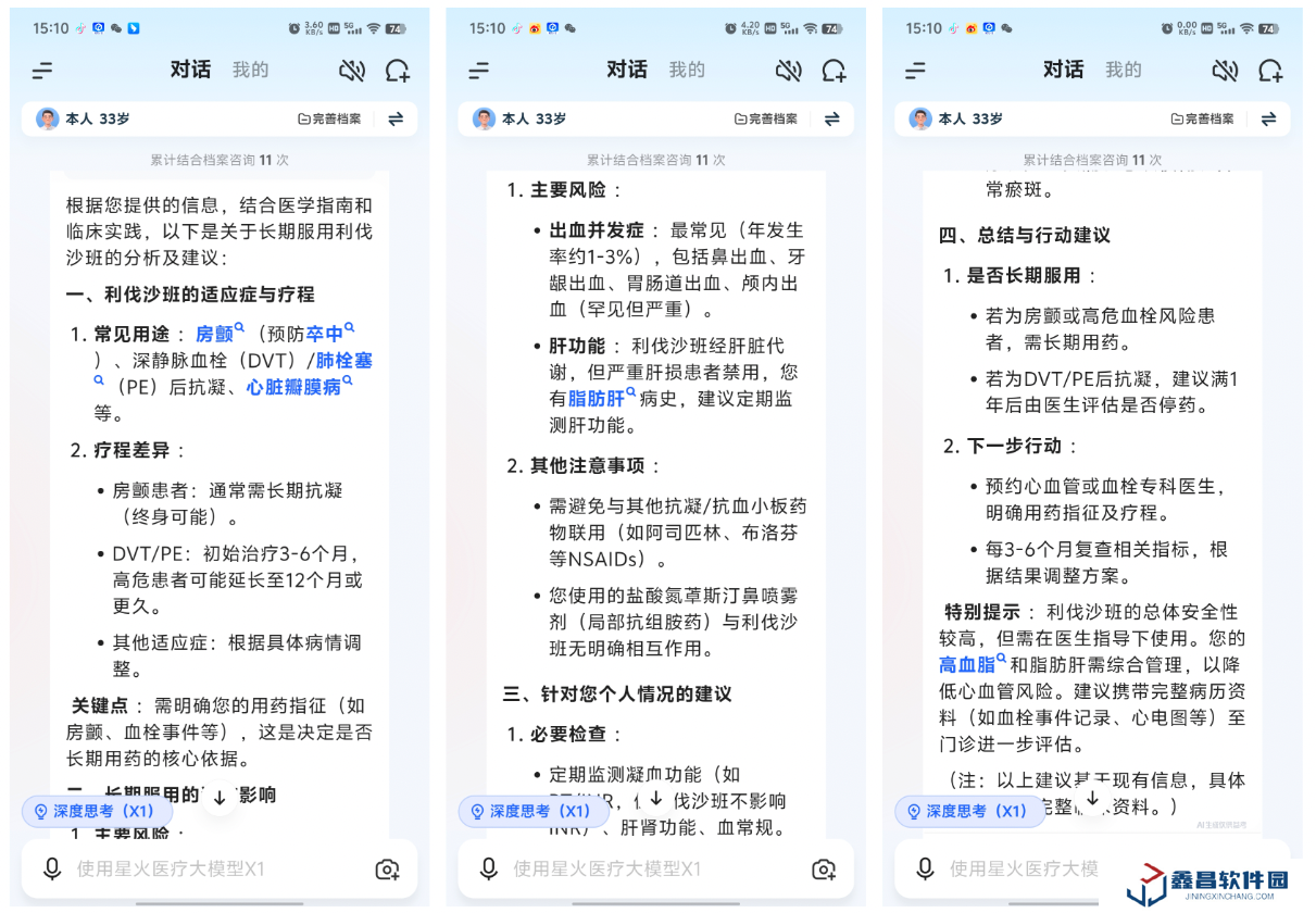 在開(kāi)啟星火醫(yī)療大模型 X1 的情況下,訊飛曉醫(yī)回答這個(gè)問(wèn)題耗時(shí) 15 秒,在回答時(shí)展現(xiàn)出詳細(xì)的思考過(guò)程,先查看了我提交的病史檔案,然后分析利伐沙班藥物藥理,接著結(jié)合藥理和我的病史和用藥史先后分析了藥物相互作用的問(wèn)題和長(zhǎng)期用藥的問(wèn)題,整個(gè)邏輯鏈條是比較通順的。